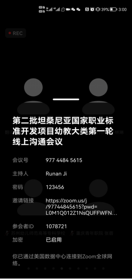 在学校继续教育学院的积极沟通和联络下,我校护理学院“坦桑尼亚婴幼儿托育师职业标准(4级5级)开发建设项目”专家团队的吴学华、何海燕、杨京楠等三位老师于11月11日参加了坦桑尼亚国家职业教育委员与中非职业教育联盟主持的第二批“坦桑尼亚国家职业标准开发建设项目”第一轮中坦专家线上沟通交流会。