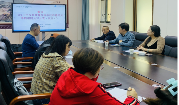 在集中学习会上,于晓斌老师领学了教育部等七部委下发的《关于加强和改进新时代师德师风建设的意见》,并结合自己二十余年的从教感悟分享了对文件精神和要求的深刻认识。侯俊民老师解读了《四川中医药高等专科学校师德师风考核细则及评分表(试行)》,特别是对其中“一票否决”的情形进行了深入剖析。