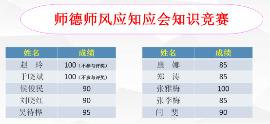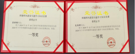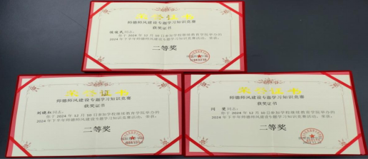 赛前,部门同志积极温习所学的文件精神和制度要求,并将其内化于心;赛中,部门同志全员参与,认真思考、仔细答题,高分多多,满分频频;赛后,大家积极总结,努力对师德师风应知应会知识再认识、再提升,纷纷表示要将精神与要求外化于行。经过对竞赛成绩的审核,确定张雅梅、吴待桦两名老师荣获竞赛一等奖,侯俊民、刘晓红、闫霏三名老师荣获二等奖。肖玲副校长和赵玲副院长分别为竞赛获奖的同志颁奖。