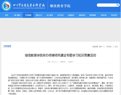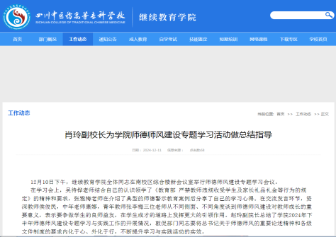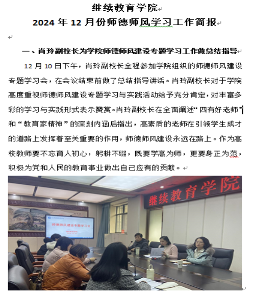 学院在12月分别以《肖玲副校长为学院师德师风建设专题学习活动做总结指导》《继续教育学院举办师德师风建设专题学习知识竞赛活动》为题刊发2篇新闻报导,上交工作简报1期。