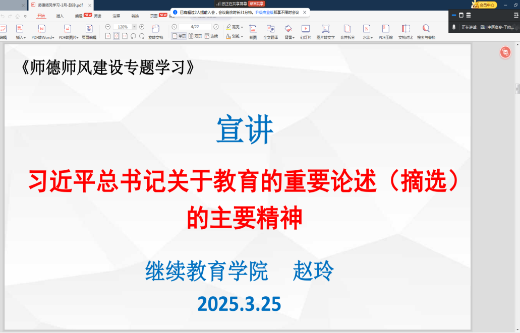 3月25日上午,继续教育学院组织全体干部职工开展了2025年春季学期师德师风教育第一次集体(线上)学习会。
