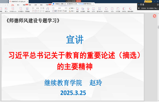 根据学校党委教师工作部下发的《关于组织开展2025年春季学期师德师风专题学习的通知》文件精神,继续教育学院在总结2024年师德师风学习实践活动的基础上,充分结合学院实际,认真制定2025年春季学期师德师风专题学习工作方案,强调全员参与、知行合一、扎实推进,进一步提升全院职工的思想政治素养和职业道德水平,推动学校教育服务的高质量发展。