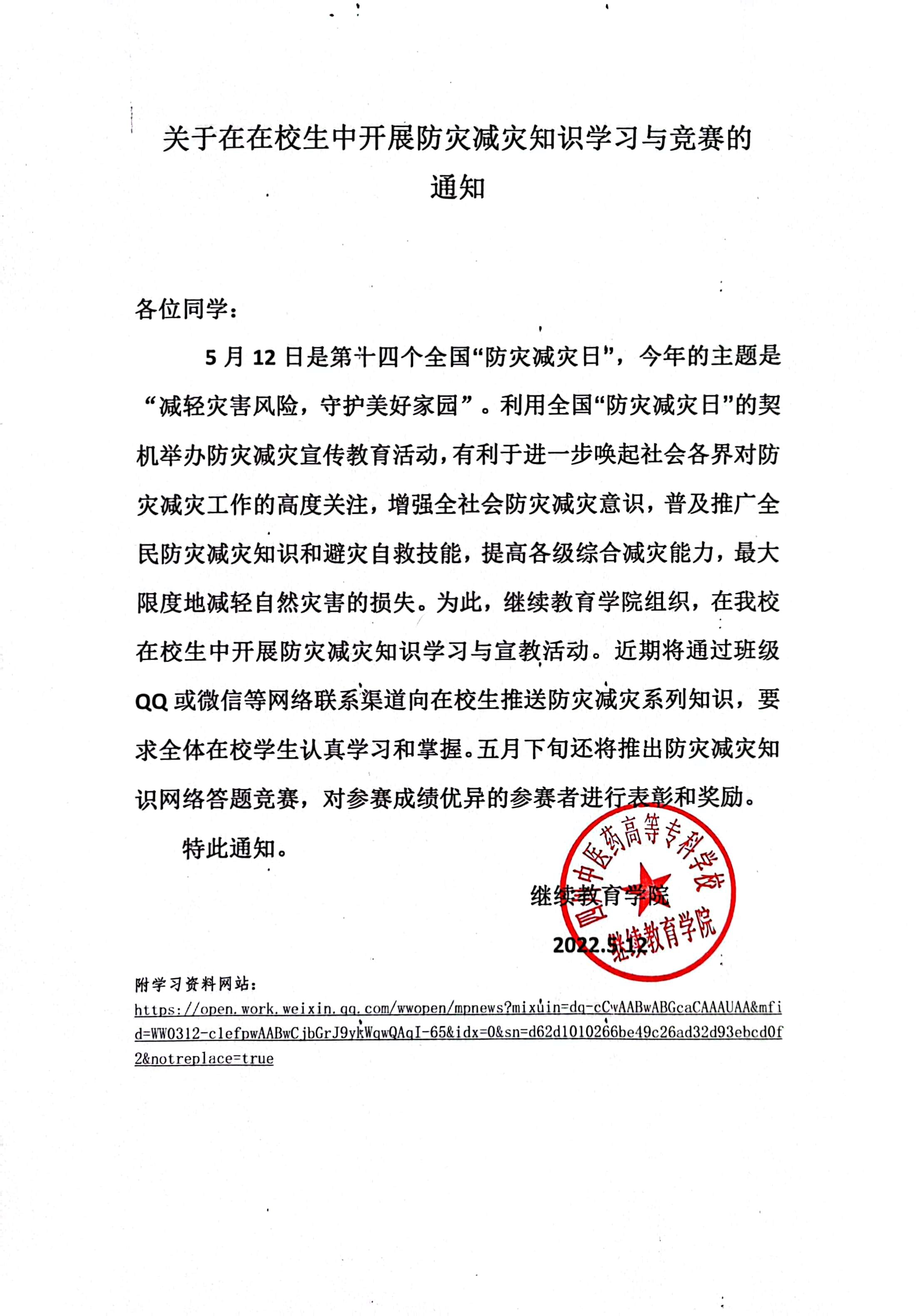 关于在在校生中开展防灾减灾知识学习与竞赛的通知