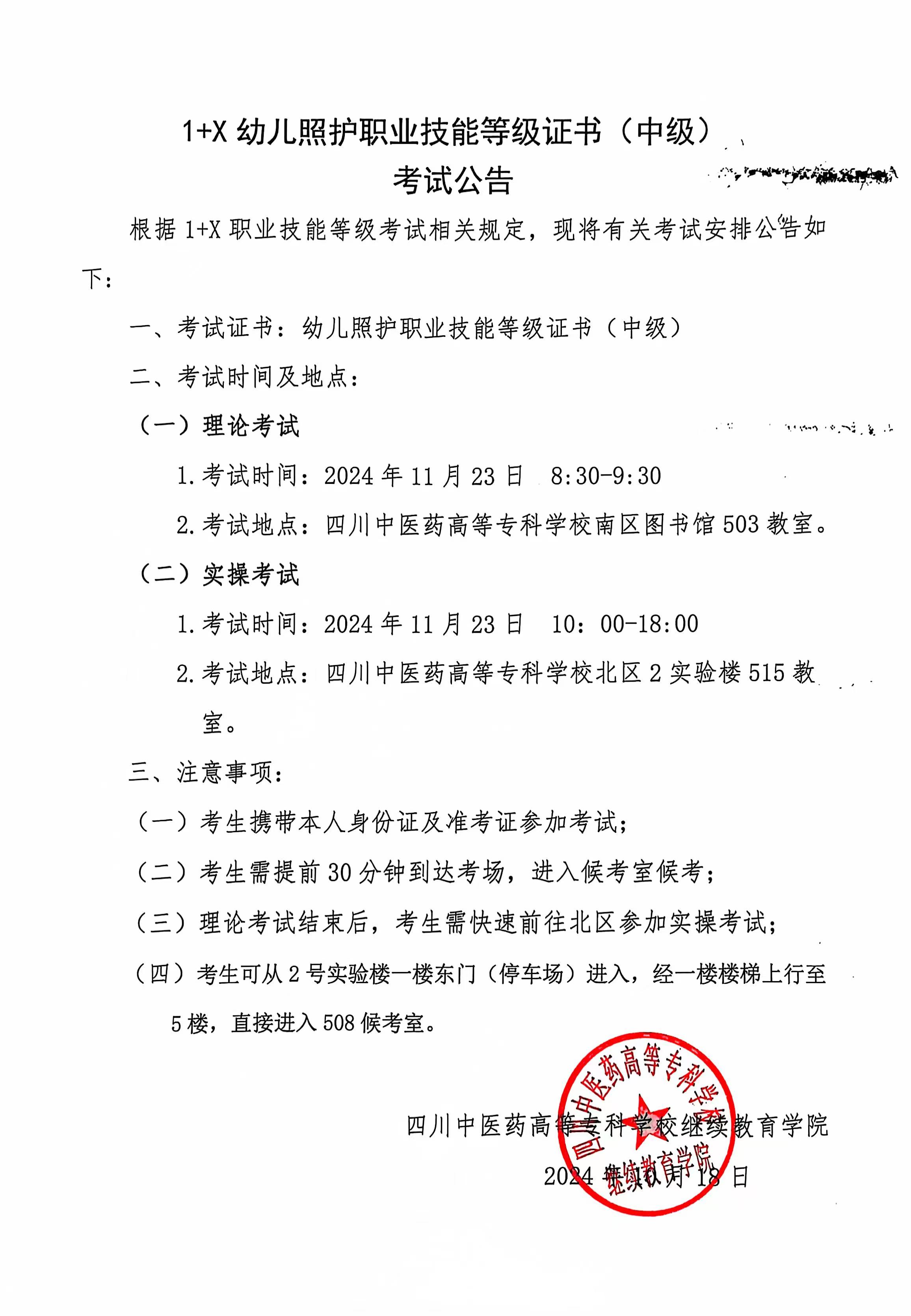 2024年11月23日1+x幼儿照护职业技能等级证书考试公告