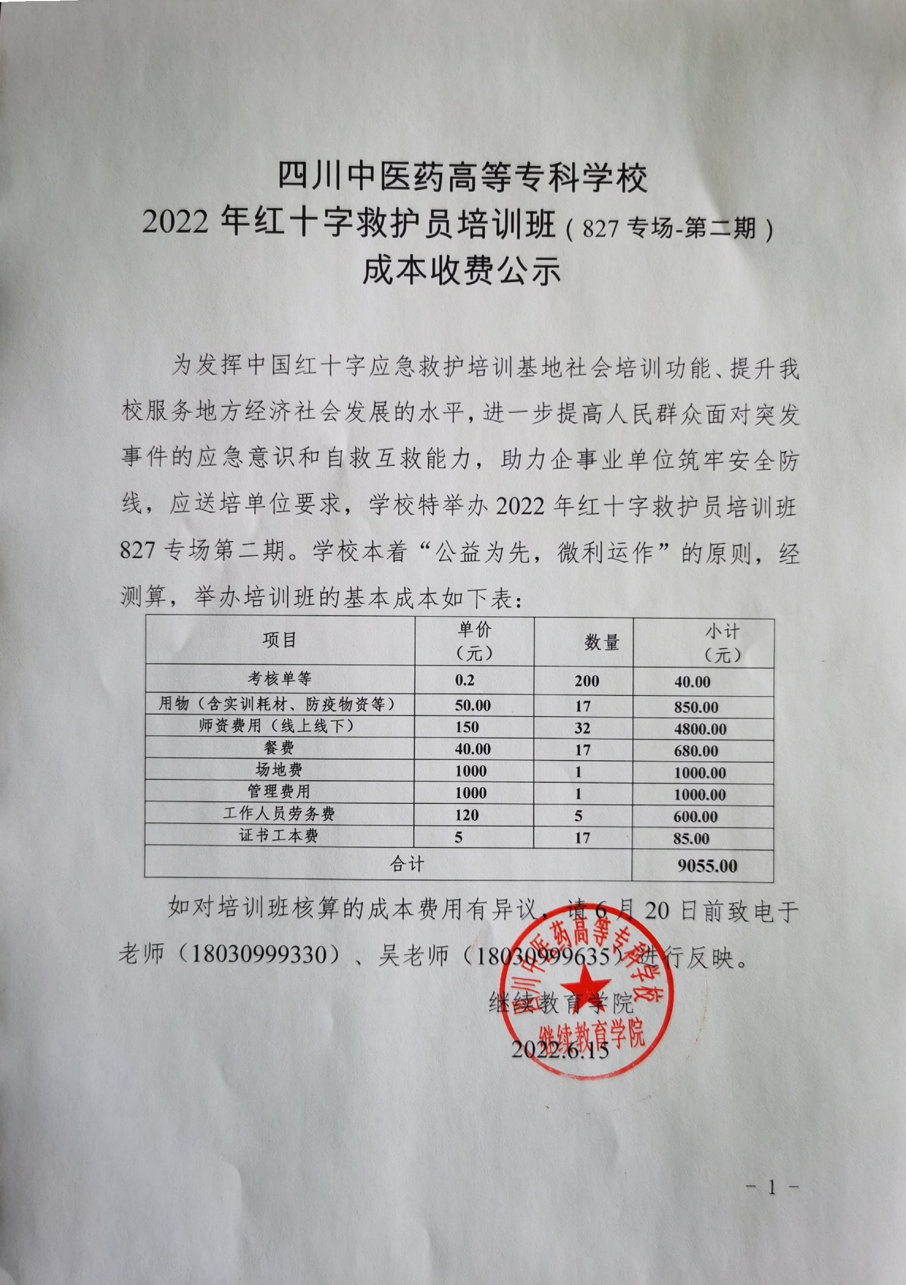 2022年红十字救护员培训班(827专场-第二期)成本收费公示