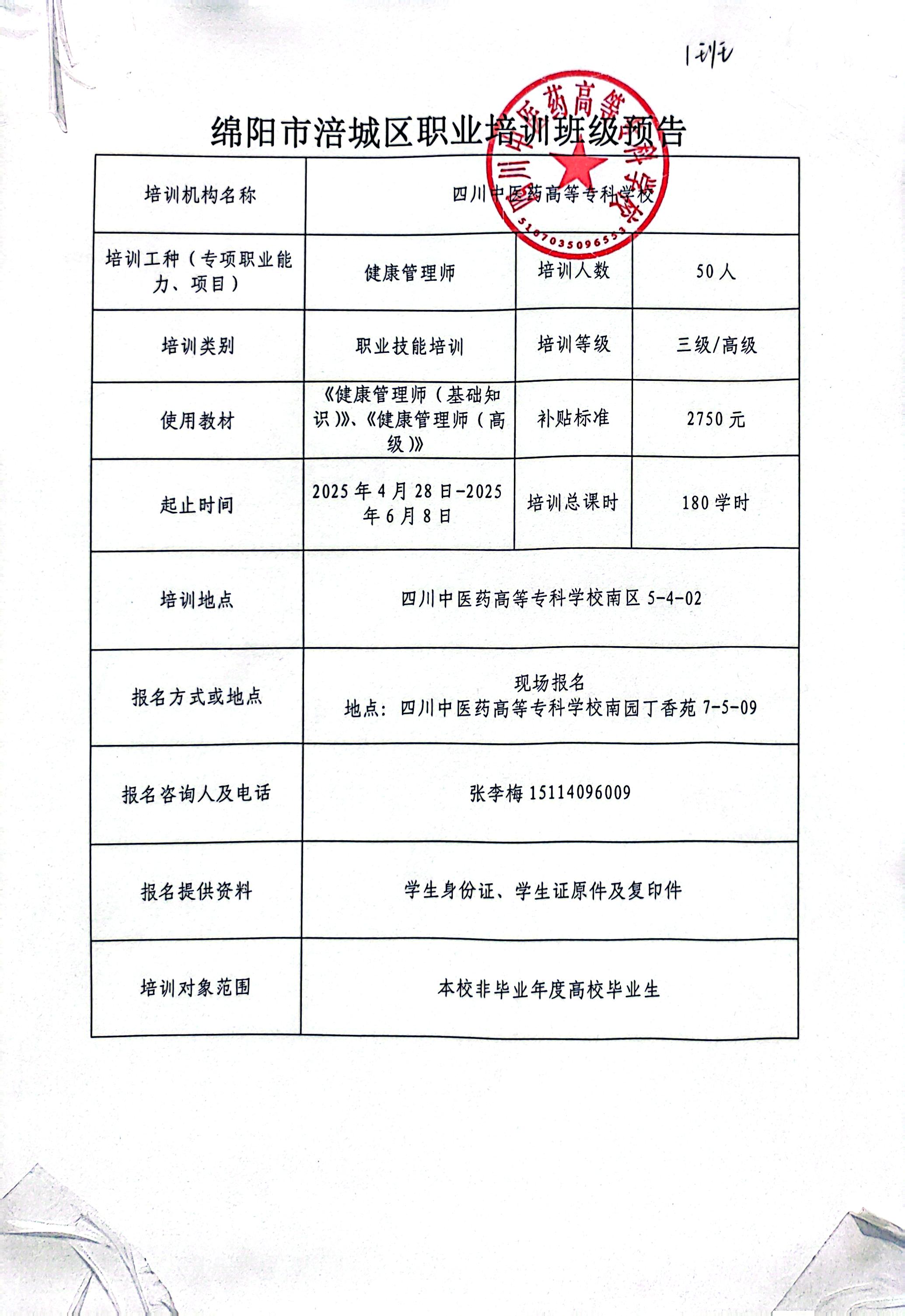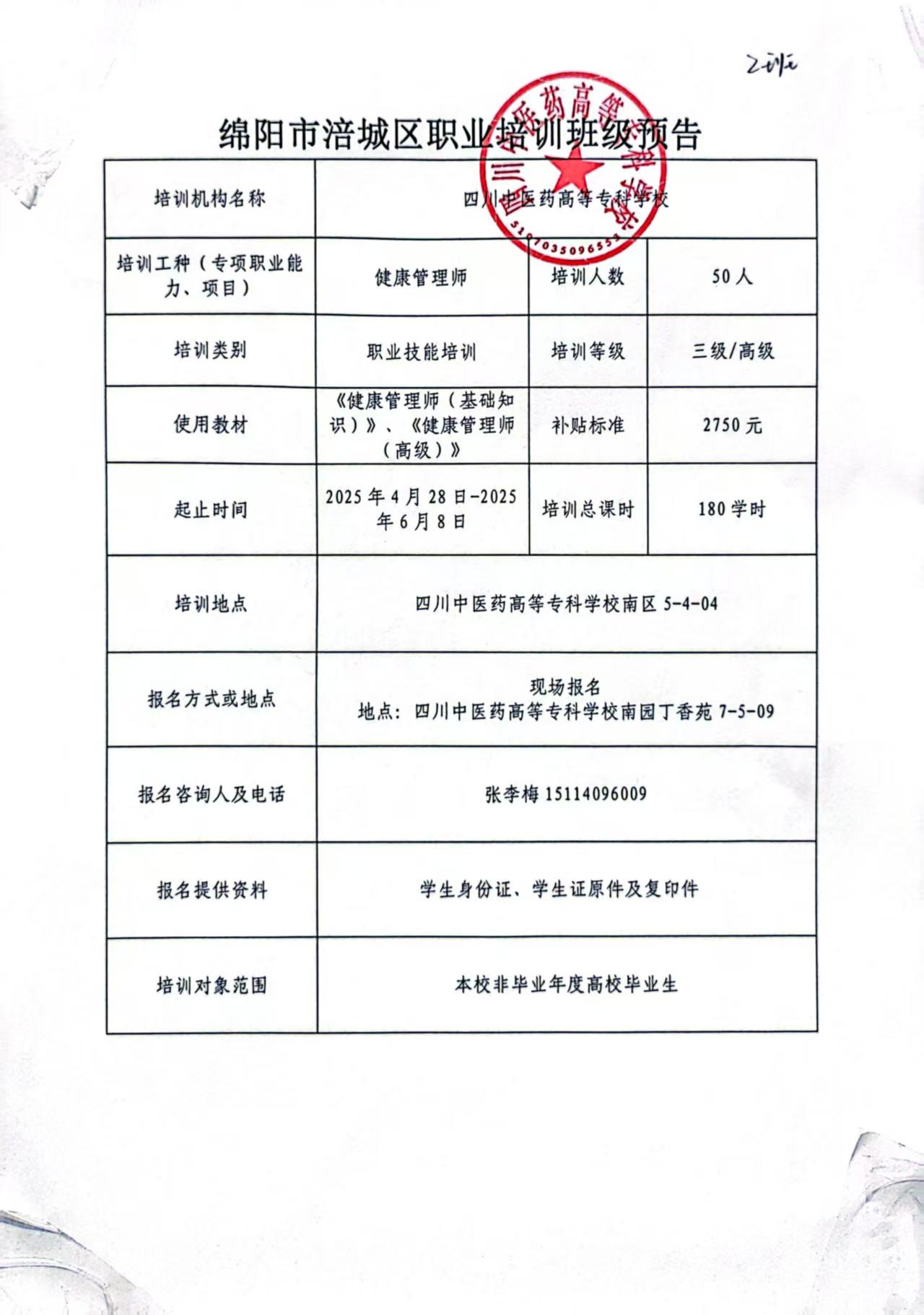 2025年绵阳市涪城区健康管理师职业培训开班预告1-2班